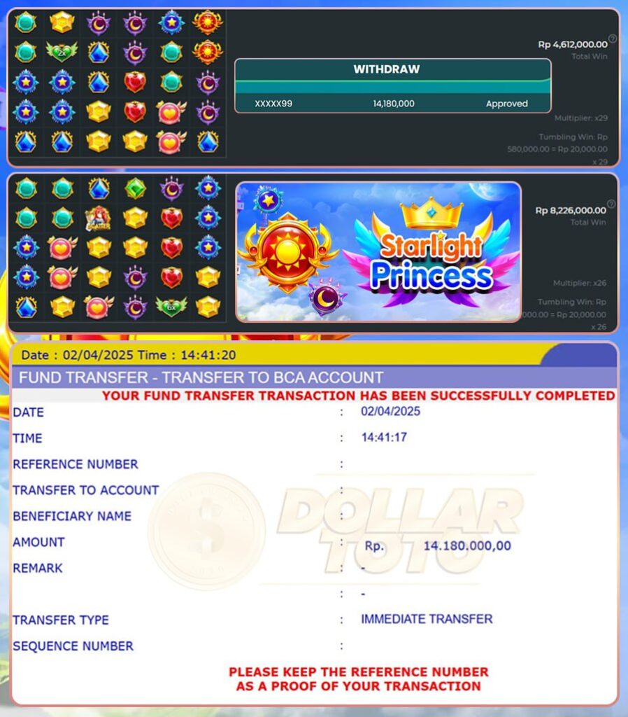 Selamat Kepada Member DOLLARTOTO dengan Username XXXXX99 Yang Beruntung Mendapatkan Kemenangan Besar di Dalam Permainan STARLIGHT PRINCESS >> PRAGMATIC PLAY SLOT.