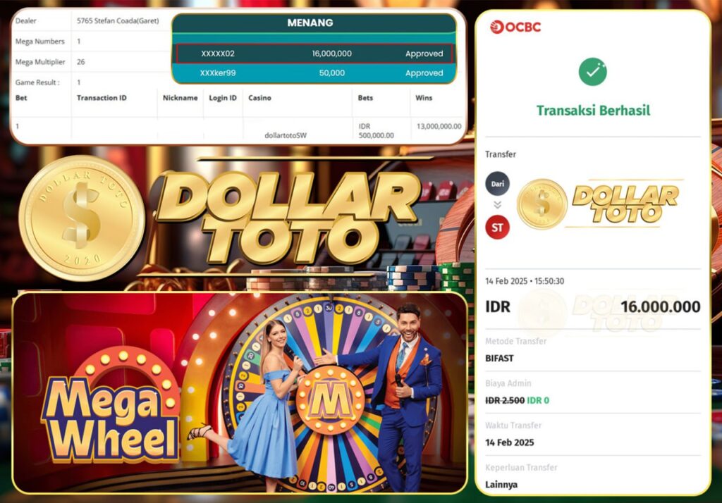 SELAMAT KEPADA MEMBER DOLLARTOTO, USER ID : XXXXX02 , MENANG DI GAME PRAGMATIC LIVE CASINO > MEGA WHEEL
