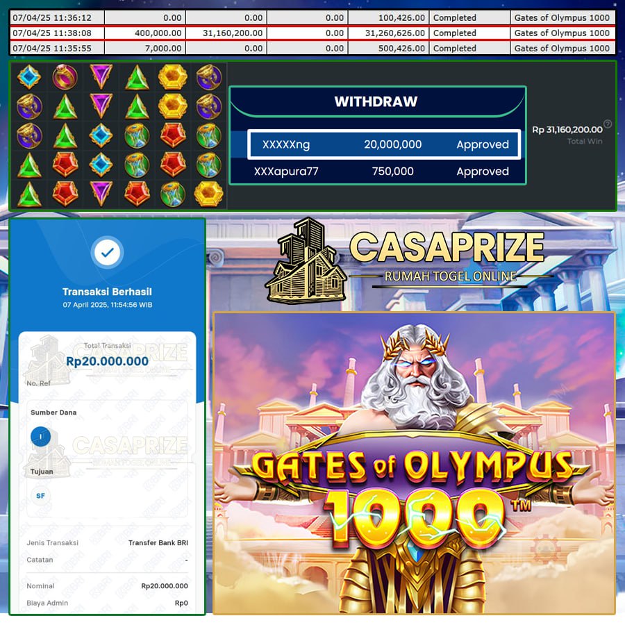 Selamat Kepada Member CASAPRIZE dengan Username XXXXXXng Yang Beruntung Mendapatkan Kemenangan Besar di CASAPRIZE Dalam Permainan PRAGMATIC PLAY >> GATES OF OLYMPUS 1000