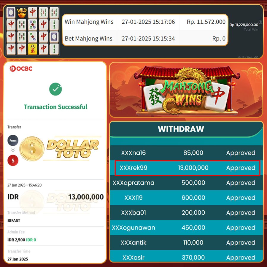 SELAMAT KEPADA MEMBER DOLLARTOTO, USER ID : XXXrek99, MENANG DI GAME