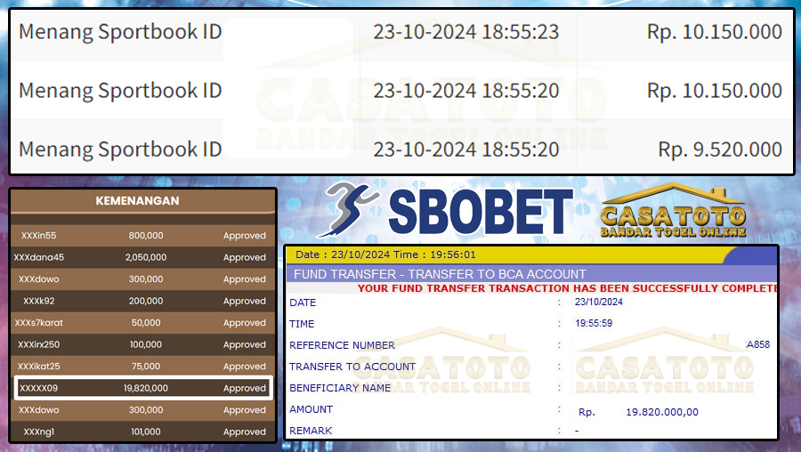 Selamat kepada member kami USER ID XXXXX09 yang telah kembali mendapatkan kemenangan besar secara terus menerus pada permainan SBOBET. Dan kemenangan yang diraih sebesar Rp.19.820.000