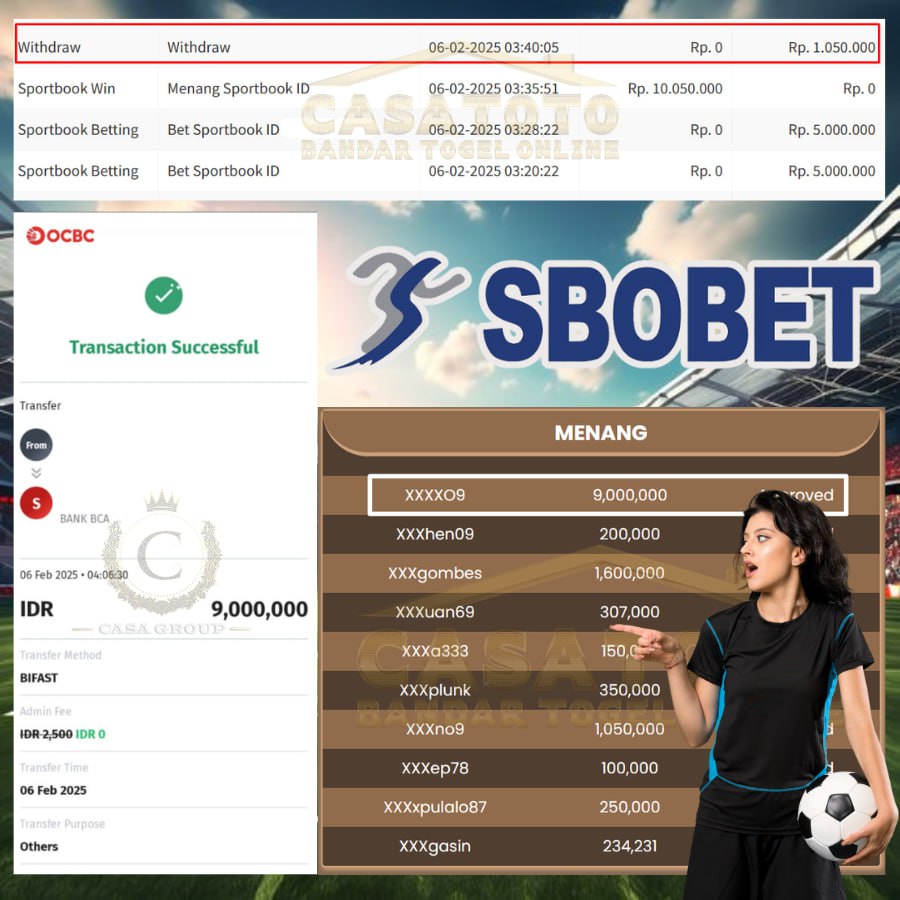 SELAMAT BAGI MEMBER CASATOTO USER ID XXXXX09 TELAH MENDAPATKAN KEMENGANGAN DI GAME SBOBET >> SPORT