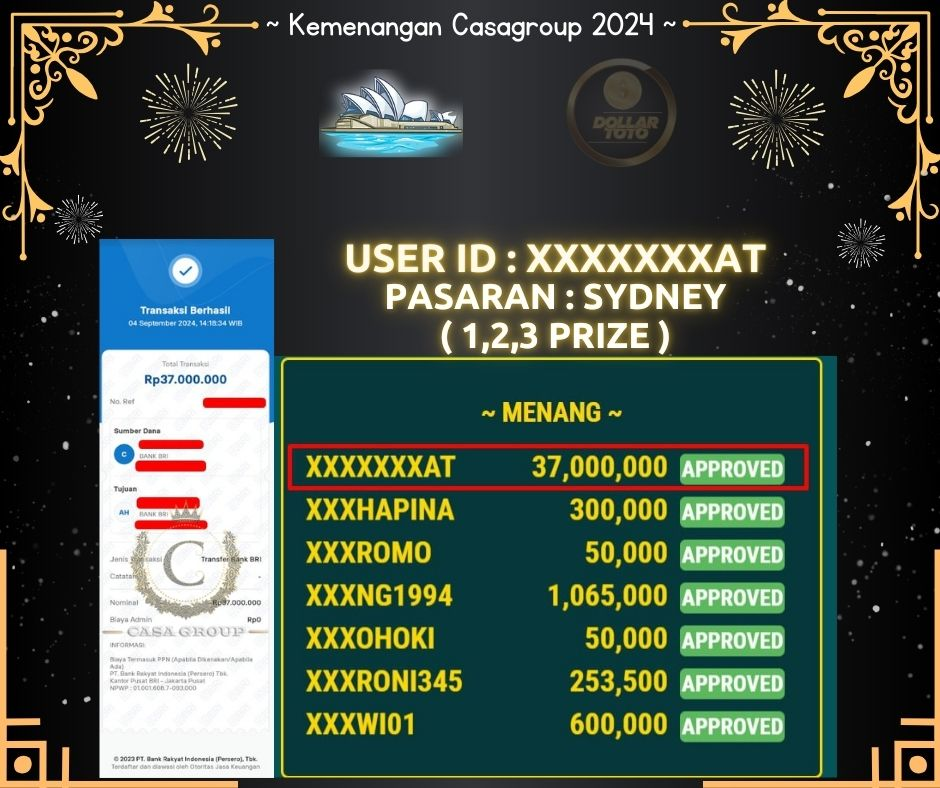 Menang di pasaran SYDNEY sebesar 37 Juta di dapatkan oleh User ID XXXXXXXAT di situs DOLLARTOTO.
