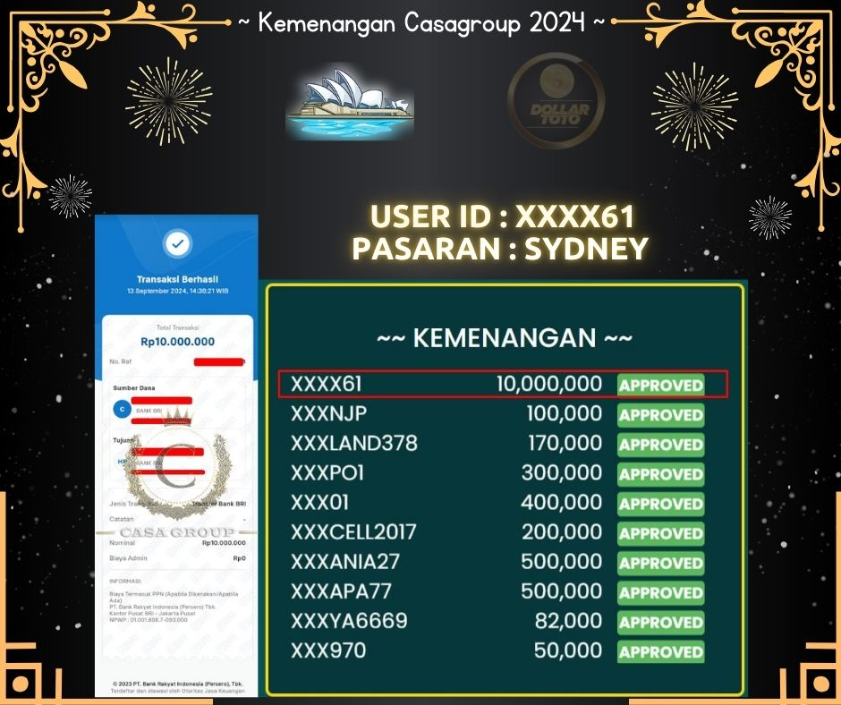 Kami ucapkan selamat kepada User ID XXXX61 di situs DOLLARTOTO yang berhasil menang di pasaran SYDNEY dengan total hadiah sebesar 10 juta dibayar lunas.