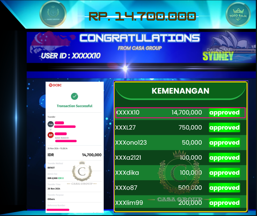 Selamat kepada member TOTORAJA dengan User id : XXXXX10 yang telah menang lagi di pasaran SYDNEY dengan Total kemenangan Rp.14,700.000 sudah di proses secepat kilat .