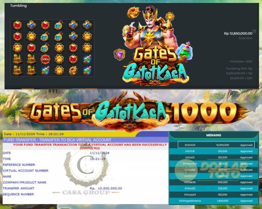 SELAMAT KEPADA MEMBER DOLLARTOTO, USER ID : XXXXX23, MENANG DI GAME PRAGMATIC SLOT> GATES OF GATOT KACA 1000.