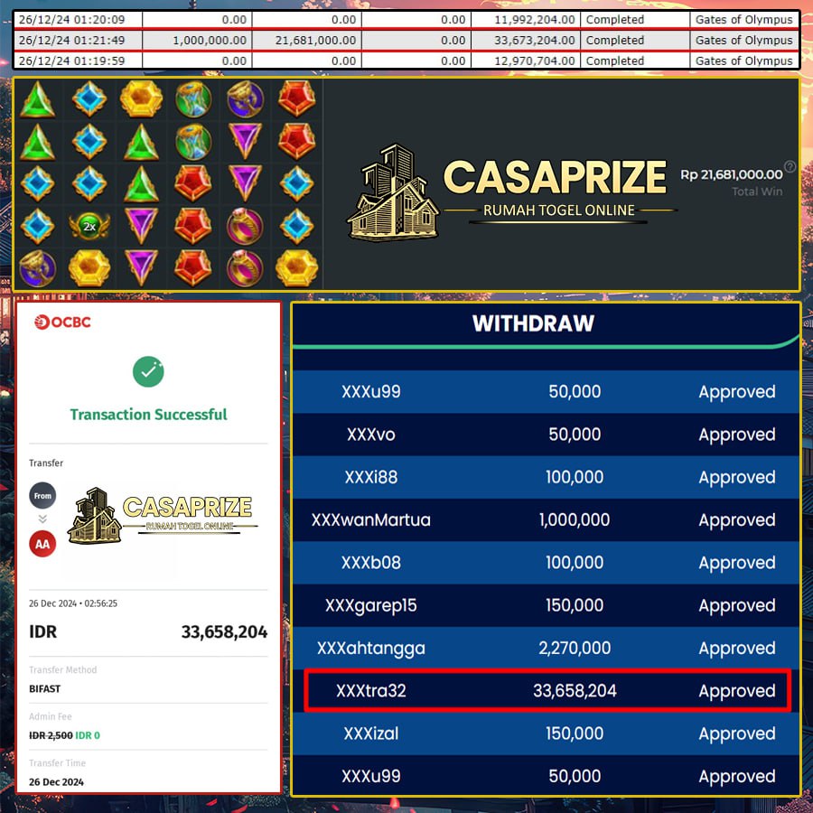 Selamat kepada bosku yang bermain di CASAPRIZE dengan user id XXXXXX32 yang telah mendapatkan kemenangan besar di game GATES OF OLYMPUS > PRAGMATIC SLOT