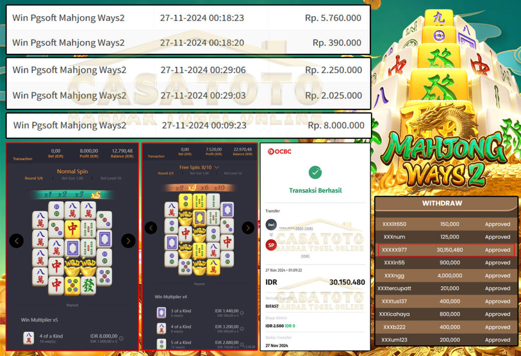 SELAMAT KEPADA MEMBER CASATOTO, USER ID : XXXX977, MENANG DI GAME PG SPFTMAHJONG WAYS 2