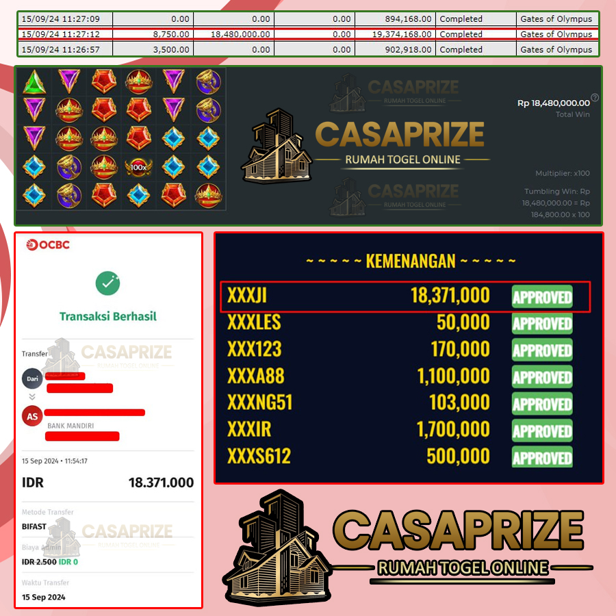 Selamat kepada user id : XXXXXI, jackpot di situs CASAPRIZE senilai Rp.18.371.000. Jangan ragu untuk main di situs ini bosku!! jelas bawa hoki untuk semua orang yang memainkannya.