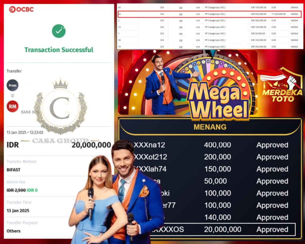 Selamat kepada bosku yang bermain di MERDEKATOTO dengan user id XXXXXXXXOS yang telah mendapatkan kemenangan besar di game MEGA WHEEL > PRAGMATIC LIVE