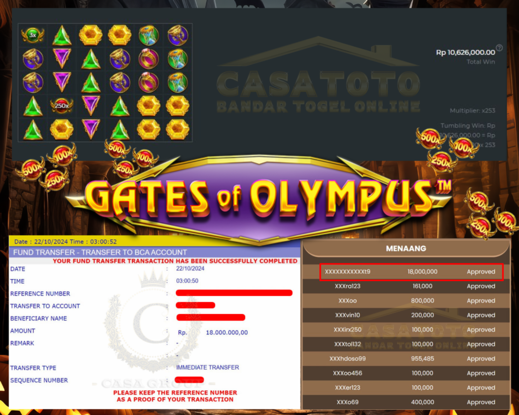 Selamat kepada member kami user id XXXXXXXXXT9 yang mendaftar di bo CASATOTO yang telah mendapatkan kemenangan besar senilai Rp. 18.000.000.