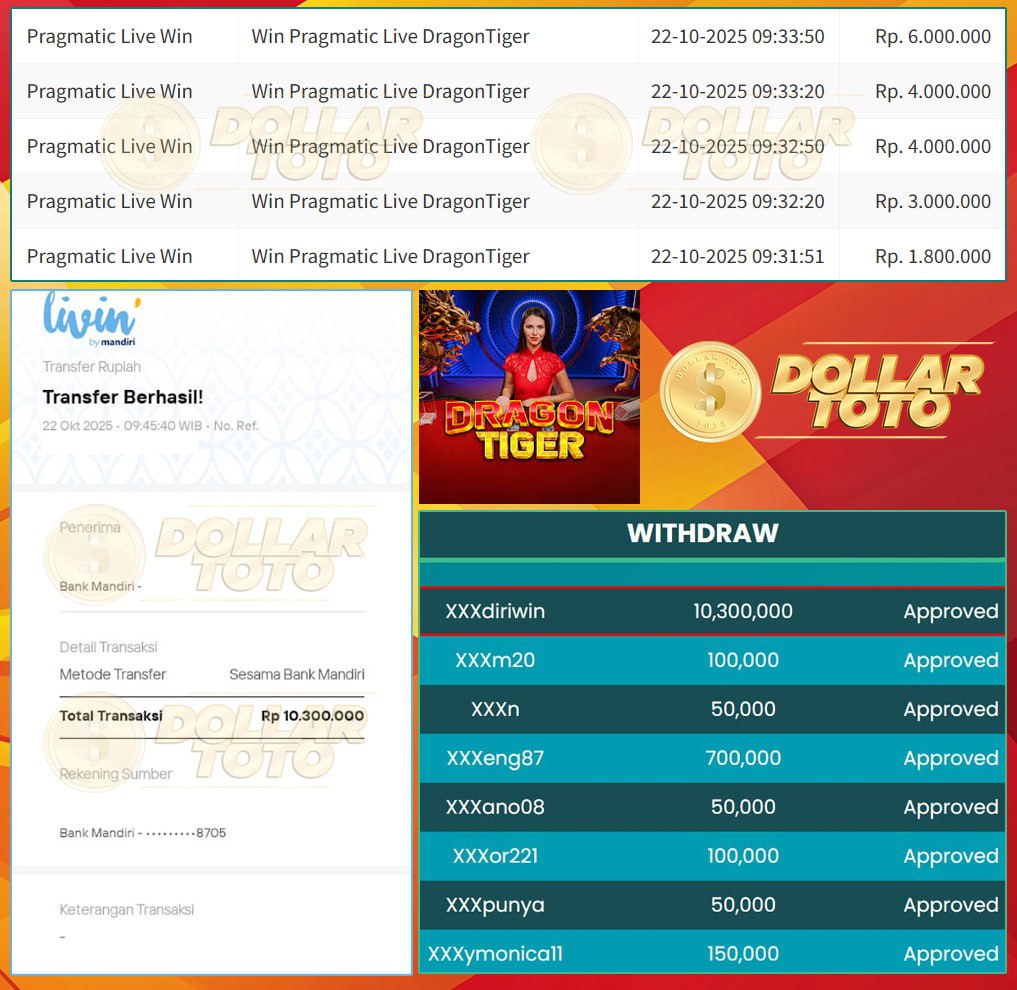 Selamat kepada bosku yang bermain di DOLLARTOTO dengan user id XXXdiriwin yang telah mendapatkan kemenangan besar di game DRAGON TIGER >> PRAGMATIC LIVE.