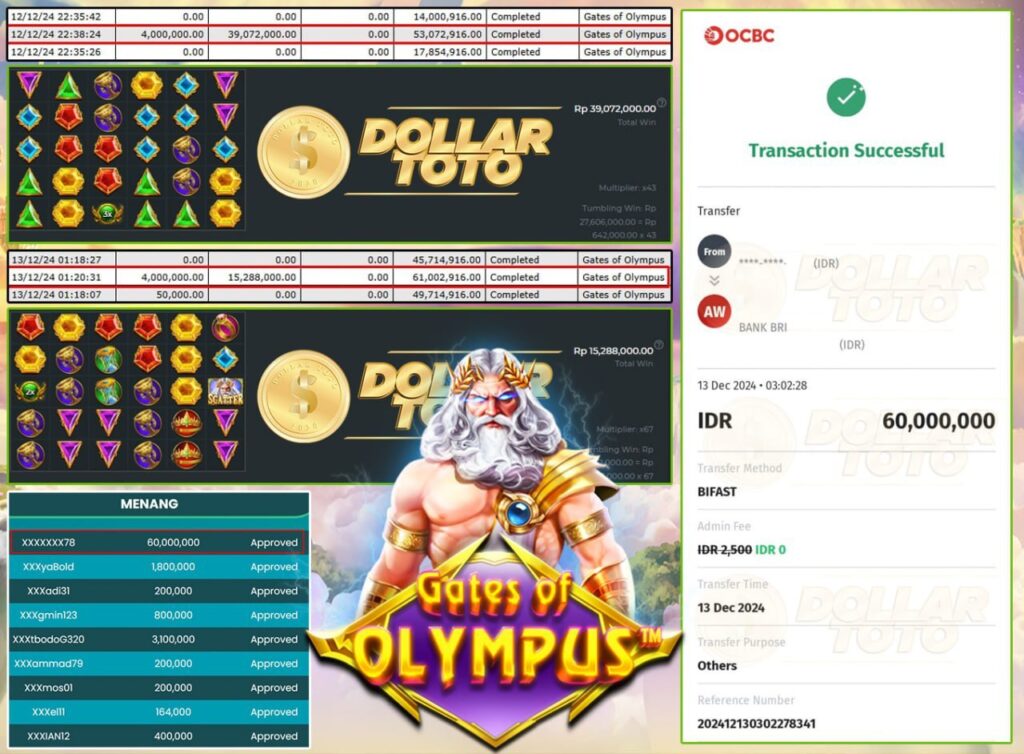 Selamat kepada bosku yang bermain di DOLLARTOTO dengan user id XXXXX4678 yang telah mendapatkan kemenangan besar di game GATES OF OLYMPUS > PRAGMATIC SLOT
