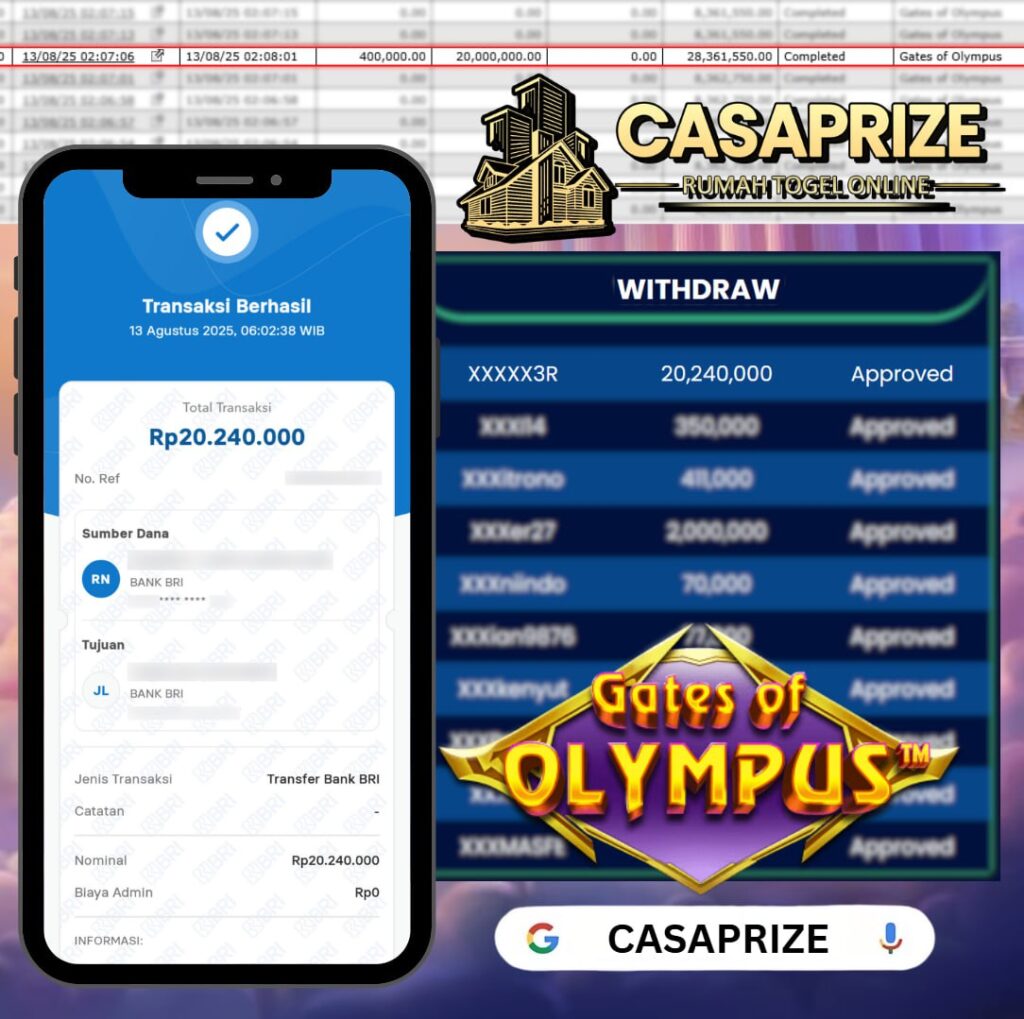Selamat Kepada Member CASAPRIZE dengan User ID JXXXXXR Atas Kemenangan di Game GATES OF OLYMPUS – PRAGMATIC PLAY.