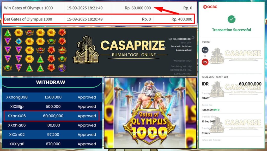 SELAMAT UNTUK MEMBER CASAPRIZE dengan Username SHxxxx16 berhasil meraih kemenangan besar di permainan GATES OF OLYMPUS 1000 – PRAGMATIC PLAY SLOT.
