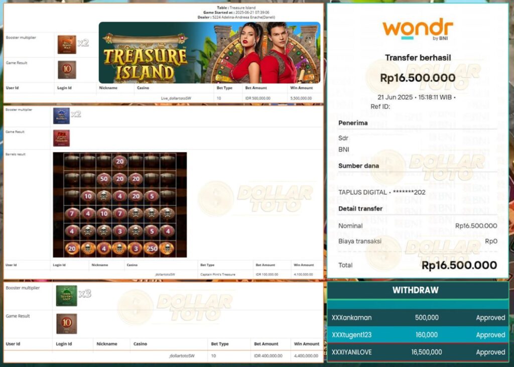 Selamat kepada member kami yang terdaftar di situs DOLLARTOTO atas id XXXiyanilove yang telah berhasil mendapat paus di PRAGMATIC PLAY LIVE > TREASURE ISLAND.