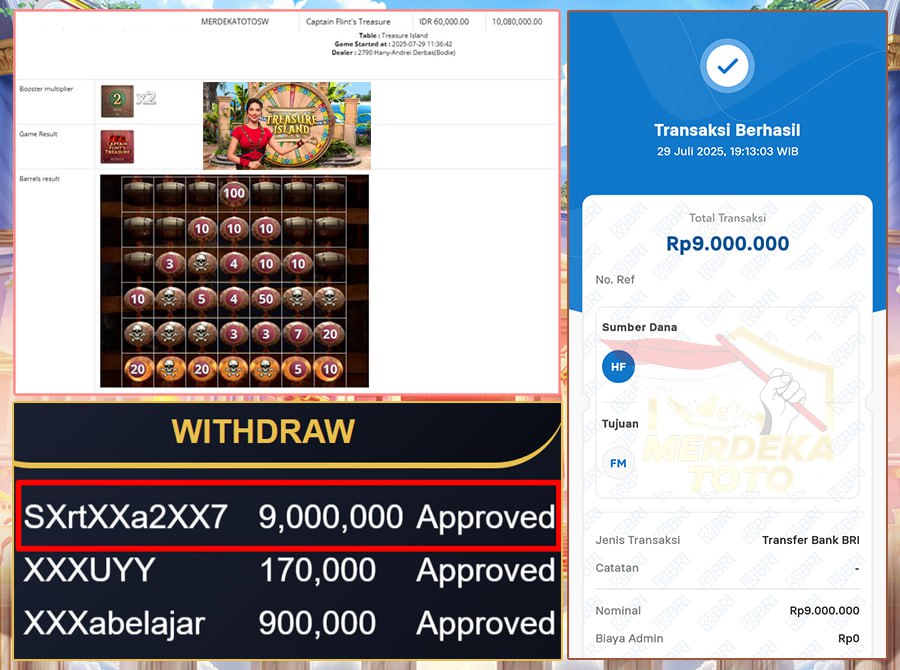 Selamat kepada member kami yang terdaftar di situs MERDEKATOTO atas id SXrtXXa2XX7 yang telah berhasil mendapat paus di PRAGMATIC PLAY LIVE > TREASURE ISLAND.