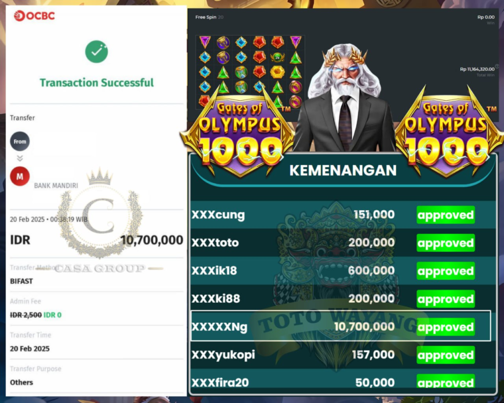 Selamat kepada member TOTOWAYANG dengan user id XXXXXNG atas kemenangan di game GATES OF OLYMPUS 1000 >> PRAGMATIC SLOT.