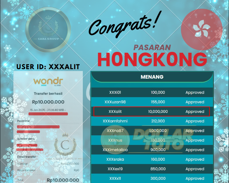 Selamat kepada User id XXXALIT yang sudah berhasil mendapatkan cuan dari hasil bet di pasaran HONGKONG . Untuk total pencairan cuan kemenangan sebesar 10 juta langsung di bayar lunas secepat kilat ,Mari gabung bersama CASAGROUP untuk mendapatkan prediksi jitu agar bisa ikut merasakan jp di pasaran hongkong .Untuk pendaftaran akun baru bisa langsung klik di sini >>CASAGROUP