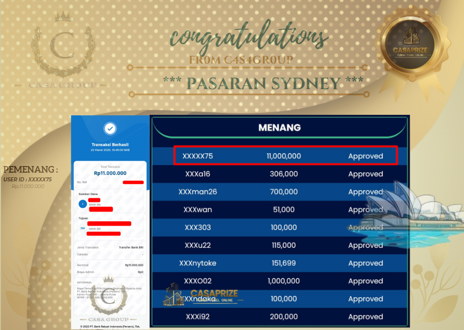 Selamat kepada user id XXXXX75  yang sudah berhasil meraih jackpot dari pasaran SYDNEY