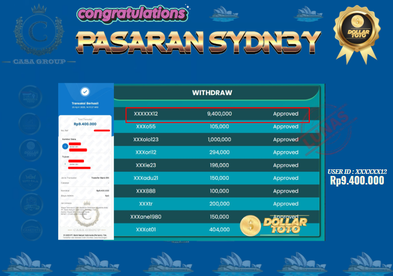 Selamat kepada user id xxxxxx12 yang telah meraih rezeki dari hasil bet di pasaran SYDNEY di situs dollartoto.