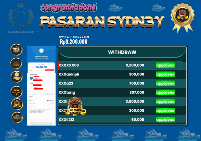 Selamat atas keburuntungan yang berpihak kepada user id XXXXXXXX09 yang sudah mendapatkan rezeki dari bet SYDNEY di situs totowayang, Total kemenangan sebesar Rp.9.200.000 telah di bayar lunas dan secepat kilat.