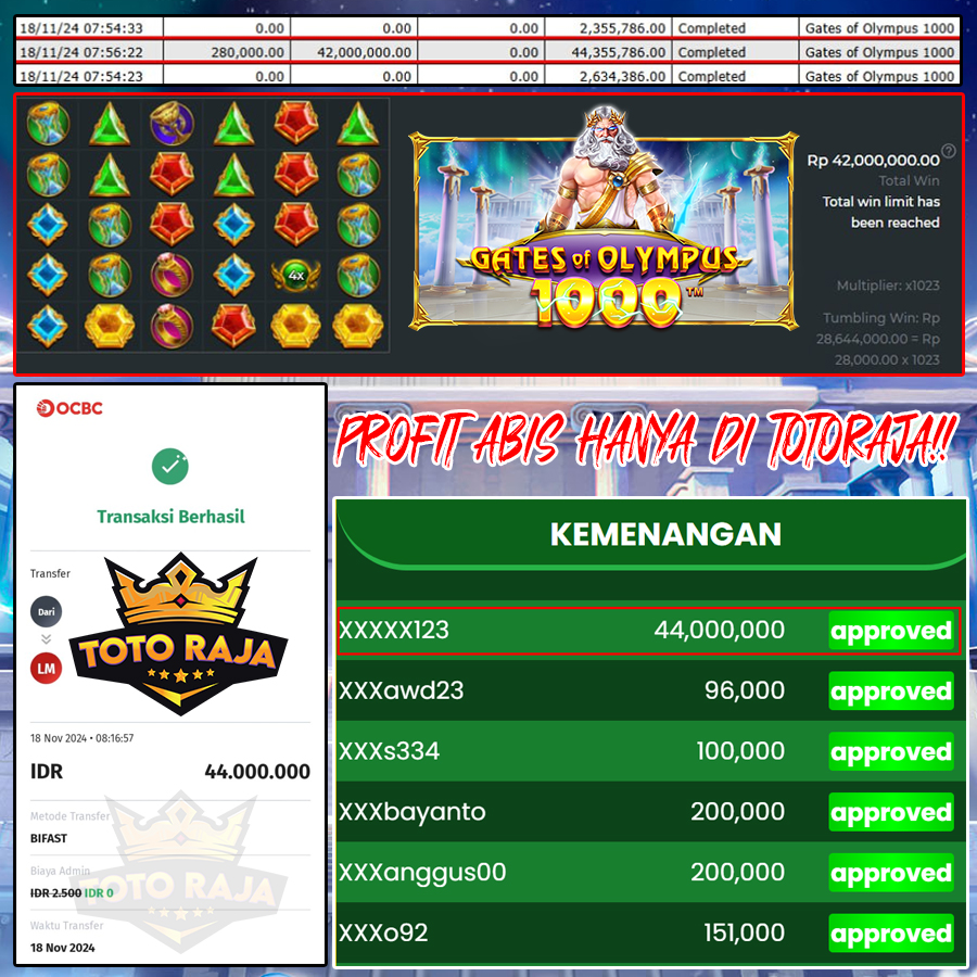 Selamat kepada bosku yang bermain di TOTORAJA dengan user id XXXXX123 yang telah mendapatkan kemenangan besar di game GATES OF OLYMPUS 1000 > PRAGMATIC PLAY