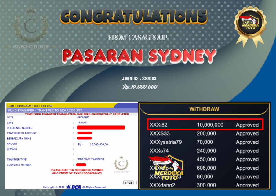 Selamat atas keburuntungan yang berpihak kepada user id xxxI82 yang sudah mendapatkan rezeki dari bet SYDNEY di situs Merdekatoto. Total kemenangan sebesar 10 juta telah di bayar lunas dan secepat kilat,