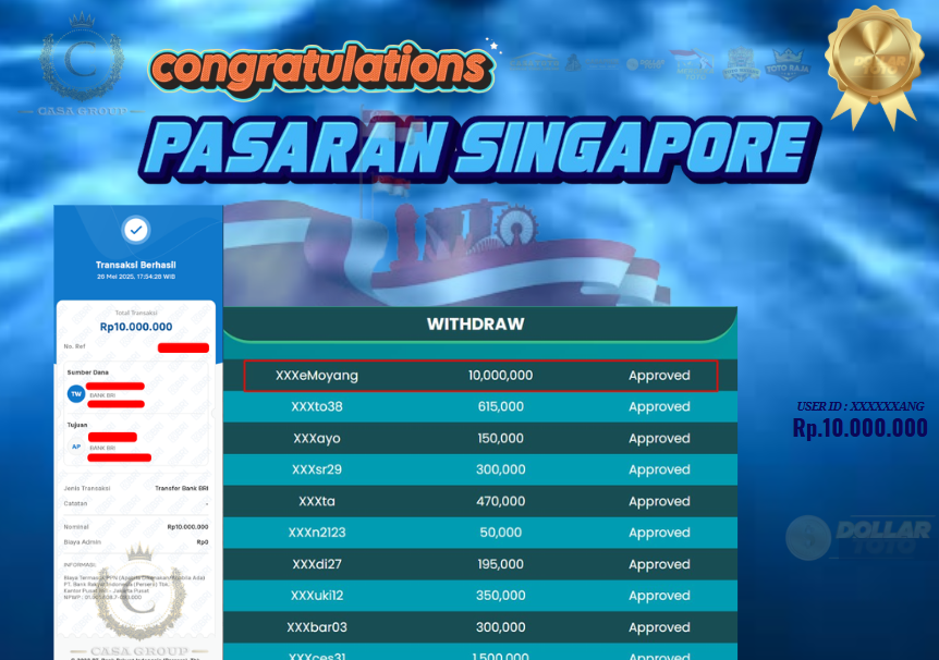 Selamat atas keberuntungan yang berpihak kepada user id xxxxxang yang sudah mendapatkan rezeki dari bet SINGAPORE di situs dollartoto total kemenangan sebesar 10 Juta telah di bayar lunas dan secepat kilat ,