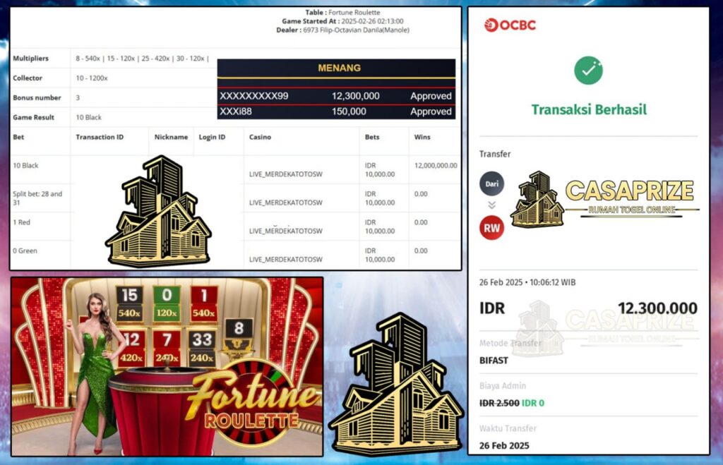 SELAMAT KEPADA MEMBER CASAPRIZE, USER ID : XXXXXXXX99, MENANG DI PRAGMATIC CASINO FORTUNE ROULETTE