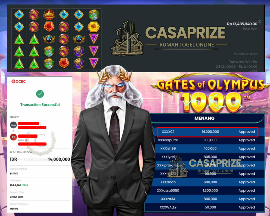 Selamat kepada member CASAPRIZE user id XXXX02 yang telah mendapat perkalian terbesar dalam permainan GATES OF OLYMPUS 1000 sebesar Rp. 14.000.000.