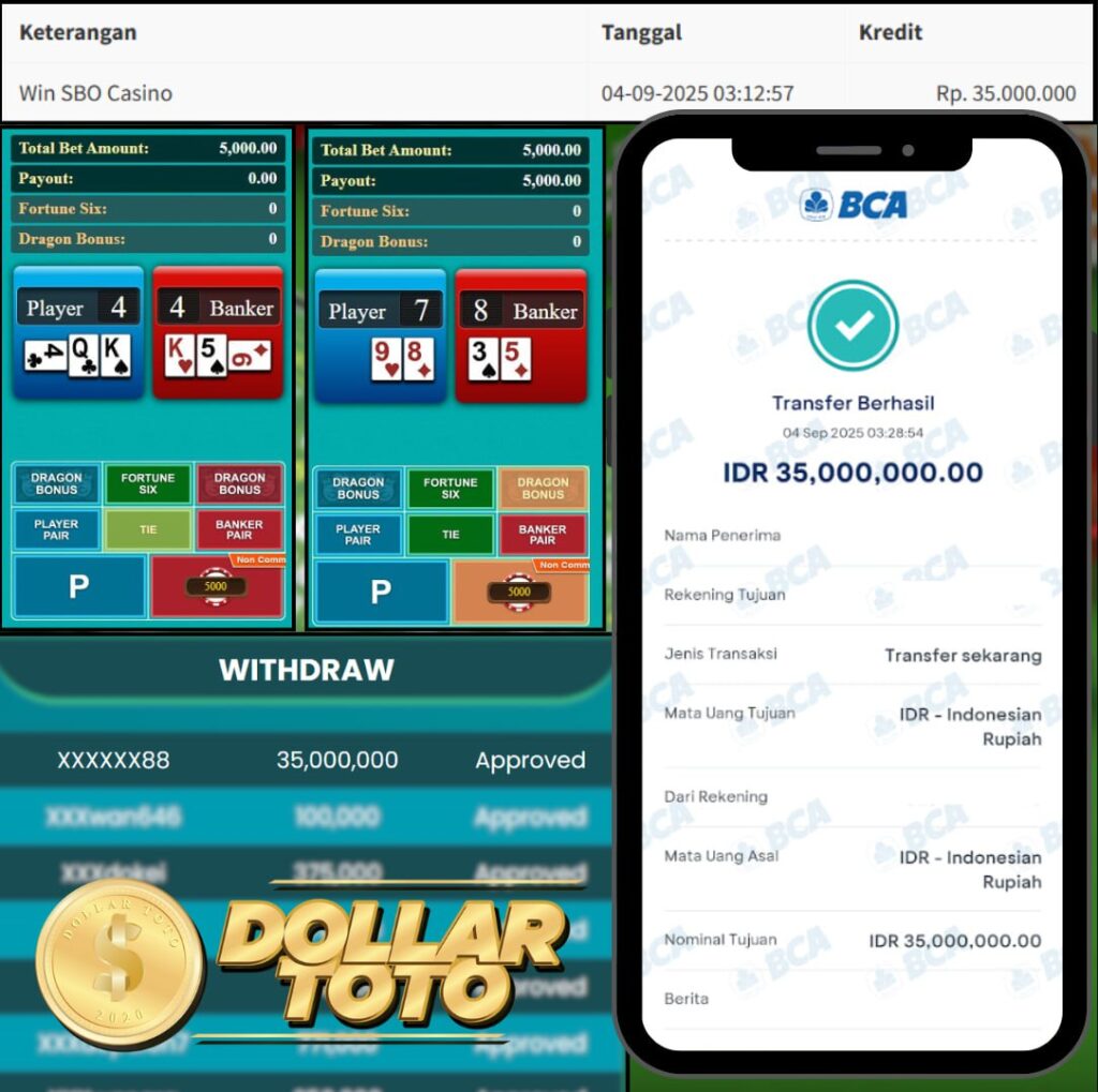Selamat atas kemenangan boss ku dengan user id HXkiXXaXX8 yang telah mendapatkan kemenangan besar di DOLLARTOTO GAME SBOBET CASINO dengan kemenangan yang luar biasa.