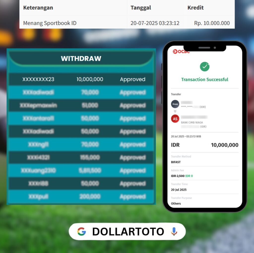 Selamat atas kemenangan boss ku dengan user id XXXrembo123 yang telah mendapatkan kemenangan besar di DOLLARTOTO GAME SBOBET CASINO dengan kemenangan yang luar biasa. Untuk dana kemenangan sebesar Rp.10.000.000 Dana kemenangan sudah berhasil diproseskan tanpa adanya hambatan sedikit pun, buat para para boskuu segera langsung daftarkan di DOLLARTOTO,