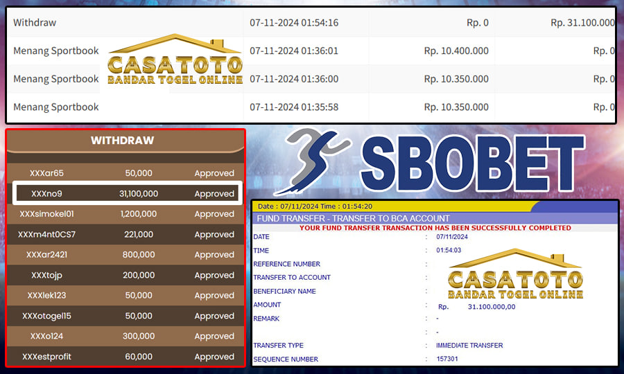 SELAMAT KEPADA MEMBER CASATOTO, USER ID : XXXN9, MENANG DI GAME SBOBET