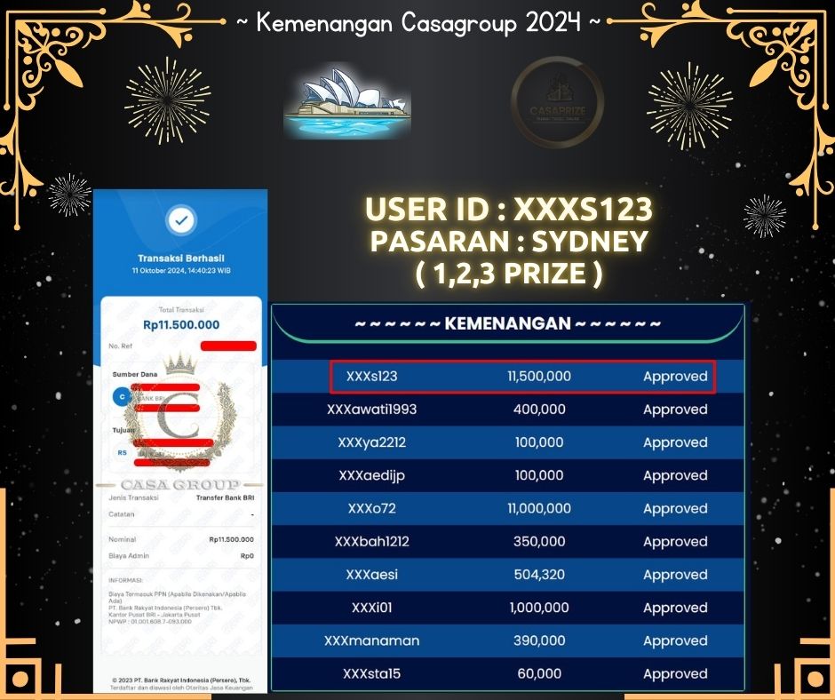 Total kemenangan di SYDNEY ( 1,2,3 PRIZE ) mencapai 11.500.000 Juta yang di menangkan oleh USER ID : XXXS123 disitus CASAPRIZE Untuk kemenangan sudah mendarat ke tujuan tanpa ada potongan.