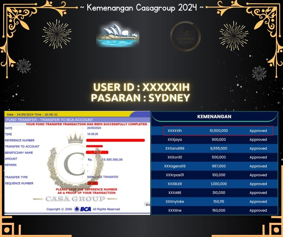 Total kemenangan di SYDNEY mencapai 10,500,000 Juta yang di menangkan oleh USER ID : XXXXXIH disitus CASAPRIZE