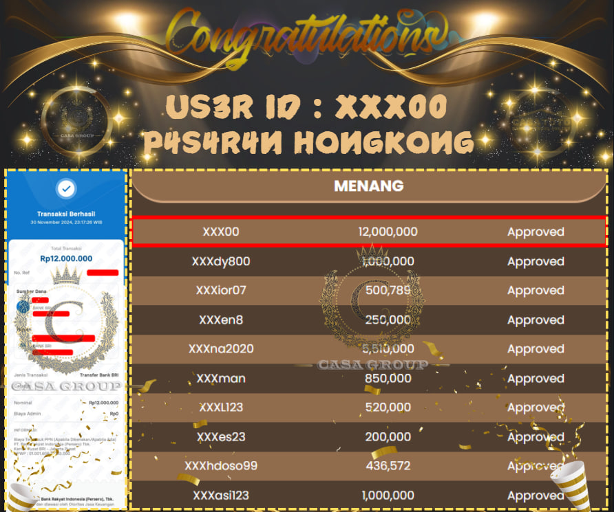 SELAMAT ATAS JACKPOT PAUS UNTUK MEMBER CASATOTO DENGAN USER ID : XXX00 YANG TELAH BERHASIL MENANG PADA PASARAN HONGKONG SEBESAR Rp. 12.000.000,- UNTUK DANA KEMENANGAN SUDAH LANGSUNG DIBAYAR LUNAS, UNTUK MEMBER YANG BELUM BERHASIL MENDAPATKAN KEMENANGAN BESAR JANGAN BERKECIL HATI SEGERA DAFTARKAN AKUN ANDA AGAR BISA MENDAPATKAN JACKPOT .