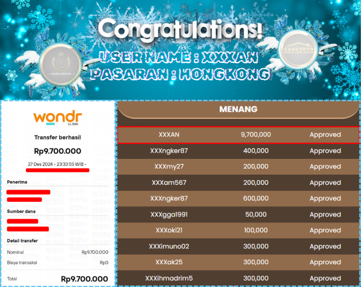 SELAMAT ATAS JACKPOT PAUS UNTUK MEMBER CASATOTO DENGAN USER ID : XXXAN YANG TELAH BERHASIL MENANG PADA PASARAN HONGKONG SEBESAR Rp. 9.700.000- UNTUK DANA KEMENANGAN SUDAH LANGSUNG DIBAYAR LUNAS, UNTUK MEMBER YANG BELUM BERHASIL MENDAPATKAN KEMENANGAN BESAR JANGAN BERKECIL HATI SEGERA DAFTARKAN AKUN ANDA AGAR BISA MENDAPATKAN JACKPOT .