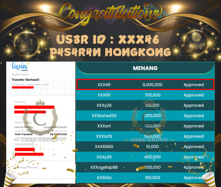 SELAMAT ATAS JACKPOT PAUS UNTUK MEMBER DOLLARTOTO DENGAN USER ID : XXX46 YANG TELAH BERHASIL MENANG PADA PASARAN HONGKONG SEBESAR Rp.9.000.000,- , UNTUK DANA KEMENANGAN SUDAH LANGSUNG DIBAYAR LUNAS, UNTUK MEMBER YANG BELUM BERHASIL MENDAPATKAN KEMENANGAN BESAR JANGAN BERKECIL HATI SEGERA DAFTARKAN AKUN ANDA AGAR BISA MENDAPATKAN JACKPOT .