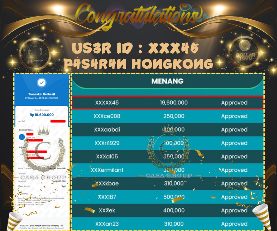 SELAMAT ATAS JACKPOT PAUS UNTUK MEMBER DOLLARTOTO DENGAN USER ID : XXX45 YANG TELAH BERHASIL MENANG PADA PASARAN HONGKONG SEBESAR Rp. 19.600.000,- UNTUK DANA KEMENANGAN SUDAH LANGSUNG DIBAYAR LUNAS, UNTUK MEMBER YANG BELUM BERHASIL MENDAPATKAN KEMENANGAN BESAR JANGAN BERKECIL HATI SEGERA DAFTARKAN AKUN ANDA AGAR BISA MENDAPATKAN JACKPOT .