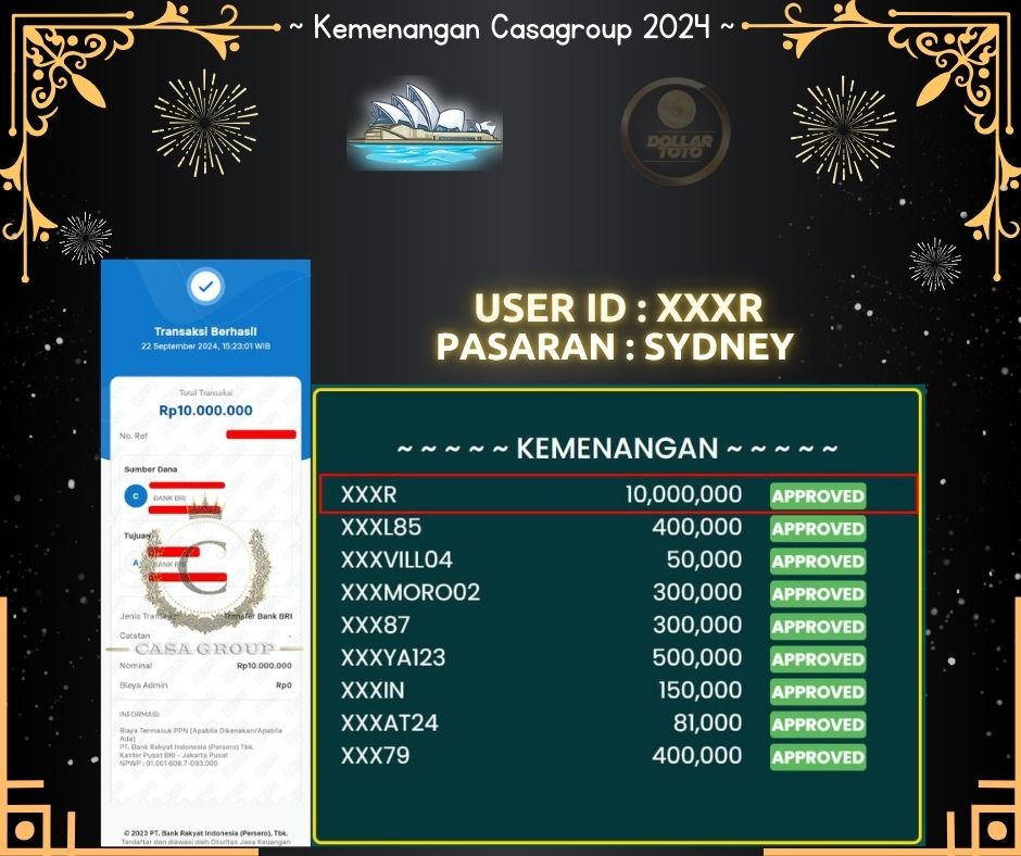 Total kemenangan di SYDNEY mencapai 10, Juta yang di menangkan oleh USER ID : XXXR disitus DOLLARTOTO
