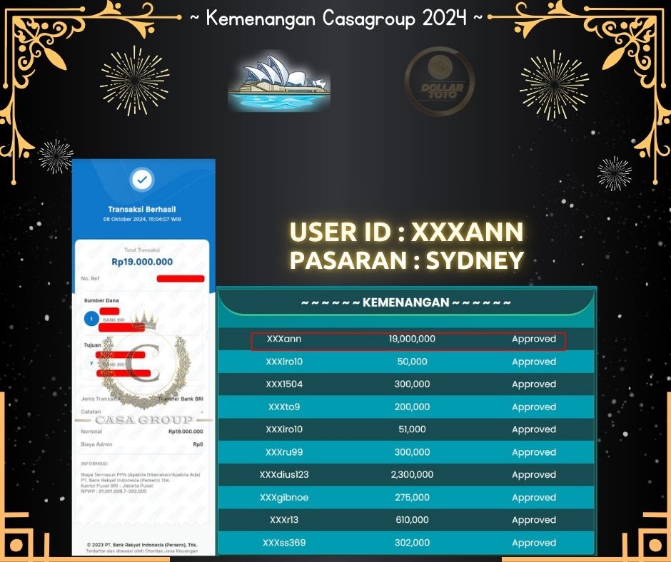 Total kemenangan di SYDNEY mencapai 19,000,000 Juta yang di menangkan oleh USER ID : XXXANN disitus DOLLARTOTO Untuk kemenangan sudah mendarat ke tujuan tanpa ada potongan.