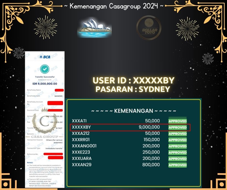 Total kemenangan di SYDNEY mencapai 9 Juta yang di menangkan oleh USER ID : XXXXXBY disitus DOLLARTOTO