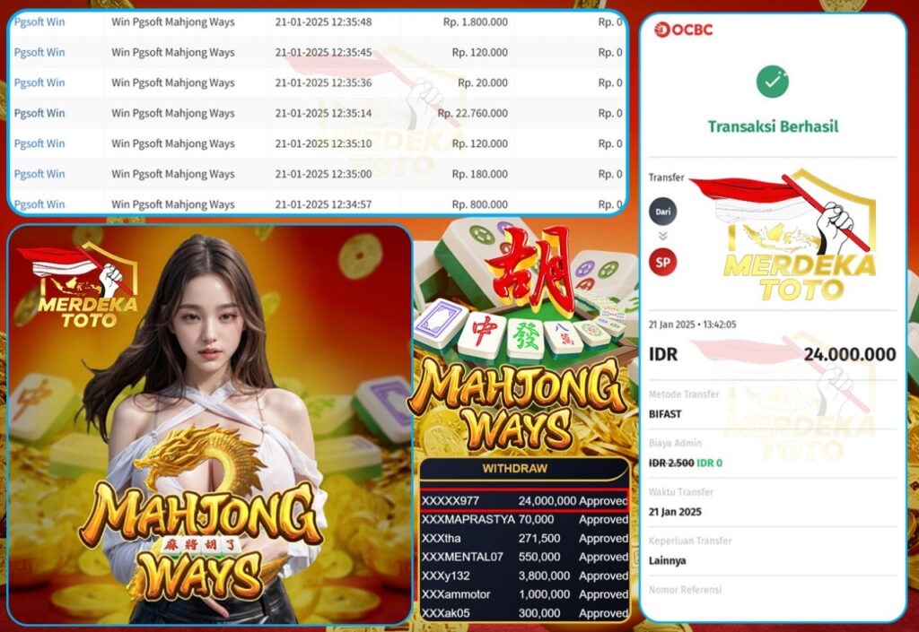 SELAMAT KEPADA MEMBER MERDEKATOTO USER ID : XXXXX977, MENANG DI GAME PG SOFT > MAHJONG WAYS