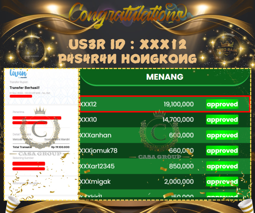 SELAMAT ATAS KEMENANGAN BESAR UNTUK MEMBER TOTORAJA DENGAN USER ID : XXX12 YANG BERHASIL MENANG PADA PASARAN HONGKONG SEBESAR Rp.19.100.000,- , UNTUK DANA KEMENANGAN SUDAH LANGSUNG DIBAYAR LUNAS, UNTUK MEMBER YANG BELUM BERHASIL MENDAPATKAN KEMENANGAN BESAR JANGAN BERKECIL HATI SEGERA DAFTARKAN AKUN ANDA AGAR BISA MENDAPATKAN JACKPOT