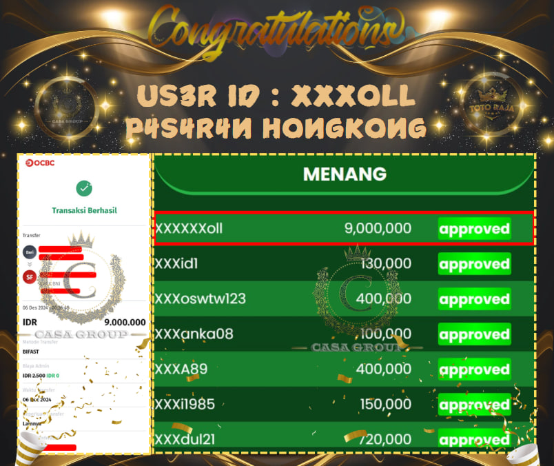 SELAMAT ATAS JACKPOT PAUS UNTUK MEMBER TOTORAJA DENGAN USER ID : XXX0LL YANG TELAH BERHASIL MENANG PADA PASARAN HONGKONG SEBESAR Rp. 9.000.000,- UNTUK DANA KEMENANGAN SUDAH LANGSUNG DIBAYAR LUNAS, UNTUK MEMBER YANG BELUM BERHASIL MENDAPATKAN KEMENANGAN BESAR JANGAN BERKECIL HATI SEGERA DAFTARKAN AKUN ANDA AGAR BISA MENDAPATKAN JACKPOT .