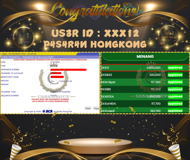 SELAMAT ATAS JACKPOT PAUS UNTUK MEMBER TOTORAJA DENGAN USER ID : XXX12 YANG TELAH BERHASIL MENANG PADA PASARAN HONGKONG SEBESAR Rp. 9.800.000,- UNTUK DANA KEMENANGAN SUDAH LANGSUNG DIBAYAR LUNAS, UNTUK MEMBER YANG BELUM BERHASIL MENDAPATKAN KEMENANGAN BESAR JANGAN BERKECIL HATI SEGERA DAFTARKAN AKUN ANDA AGAR BISA MENDAPATKAN JACKPOT .