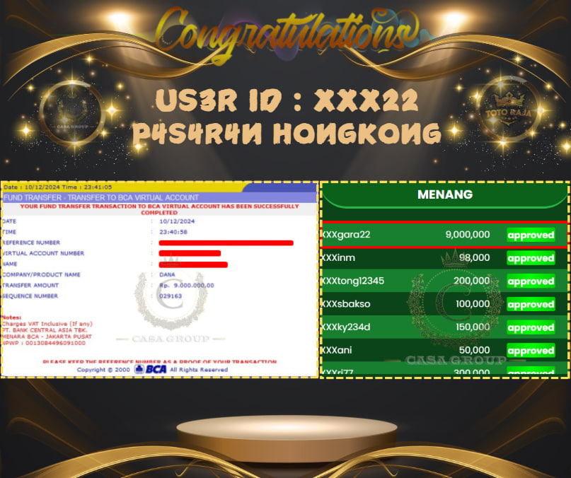SELAMAT ATAS JACKPOT PAUS UNTUK MEMBER TOTORAJA DENGAN USER ID : XXXGARA22 YANG TELAH BERHASIL MENANG PADA PASARAN HONGKONG SEBESAR Rp. 9.000.000,- UNTUK DANA KEMENANGAN SUDAH LANGSUNG DIBAYAR LUNAS, UNTUK MEMBER YANG BELUM BERHASIL MENDAPATKAN KEMENANGAN BESAR JANGAN BERKECIL HATI SEGERA DAFTARKAN AKUN ANDA AGAR BISA MENDAPATKAN JACKPOT .