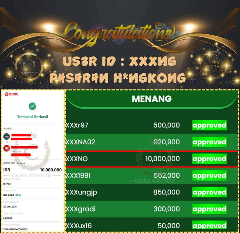 SELAMAT ATAS JACKPOT PAUS UNTUK MEMBER TOTORAJA DENGAN USER ID : XXXNG YANG TELAH BERHASIL MENANG PADA PASARAN HONGKONG SEBESAR Rp. 10.000.000,- UNTUK DANA KEMENANGAN SUDAH LANGSUNG DIBAYAR LUNAS, UNTUK MEMBER YANG BELUM BERHASIL MENDAPATKAN KEMENANGAN BESAR JANGAN BERKECIL HATI SEGERA DAFTARKAN AKUN ANDA AGAR BISA MENDAPATKAN JACKPOT .