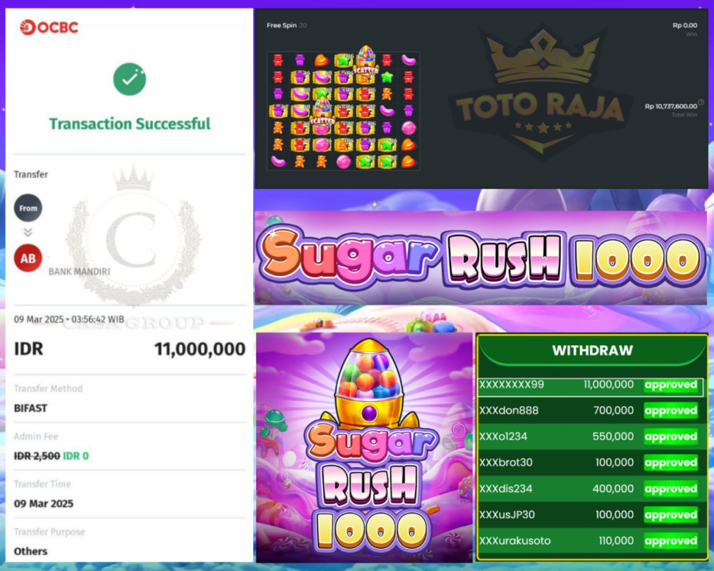 Selamat kepada bosku yang bermain di TOTORAJA dengan user id XXXXXXX99 yang telah mendapatkan kemenangan besar di game SUGAR RUSH 1000 > PRAGMATIC SLOT
